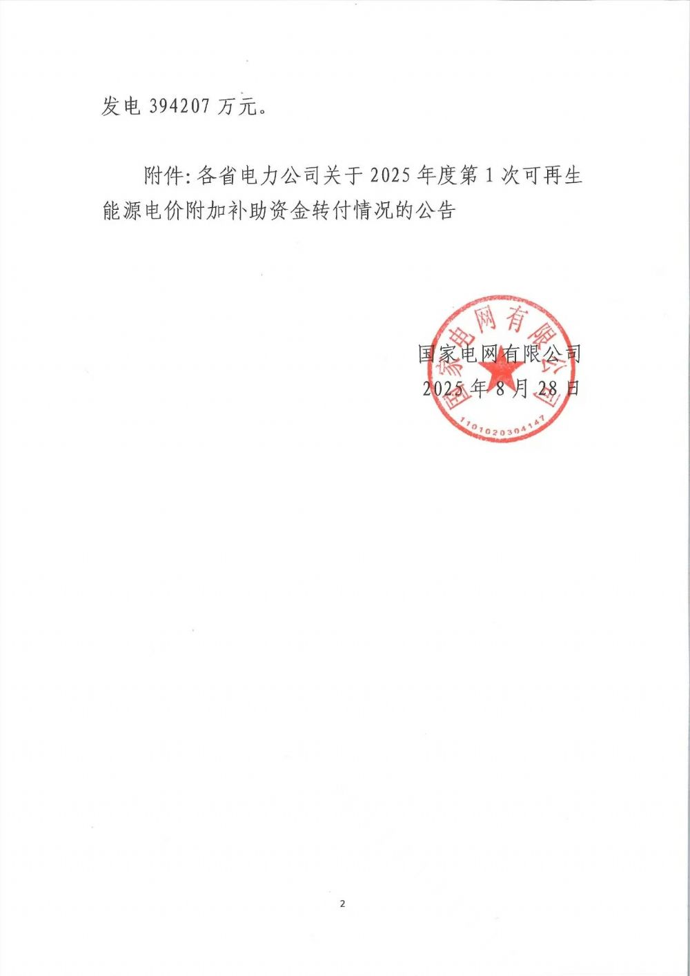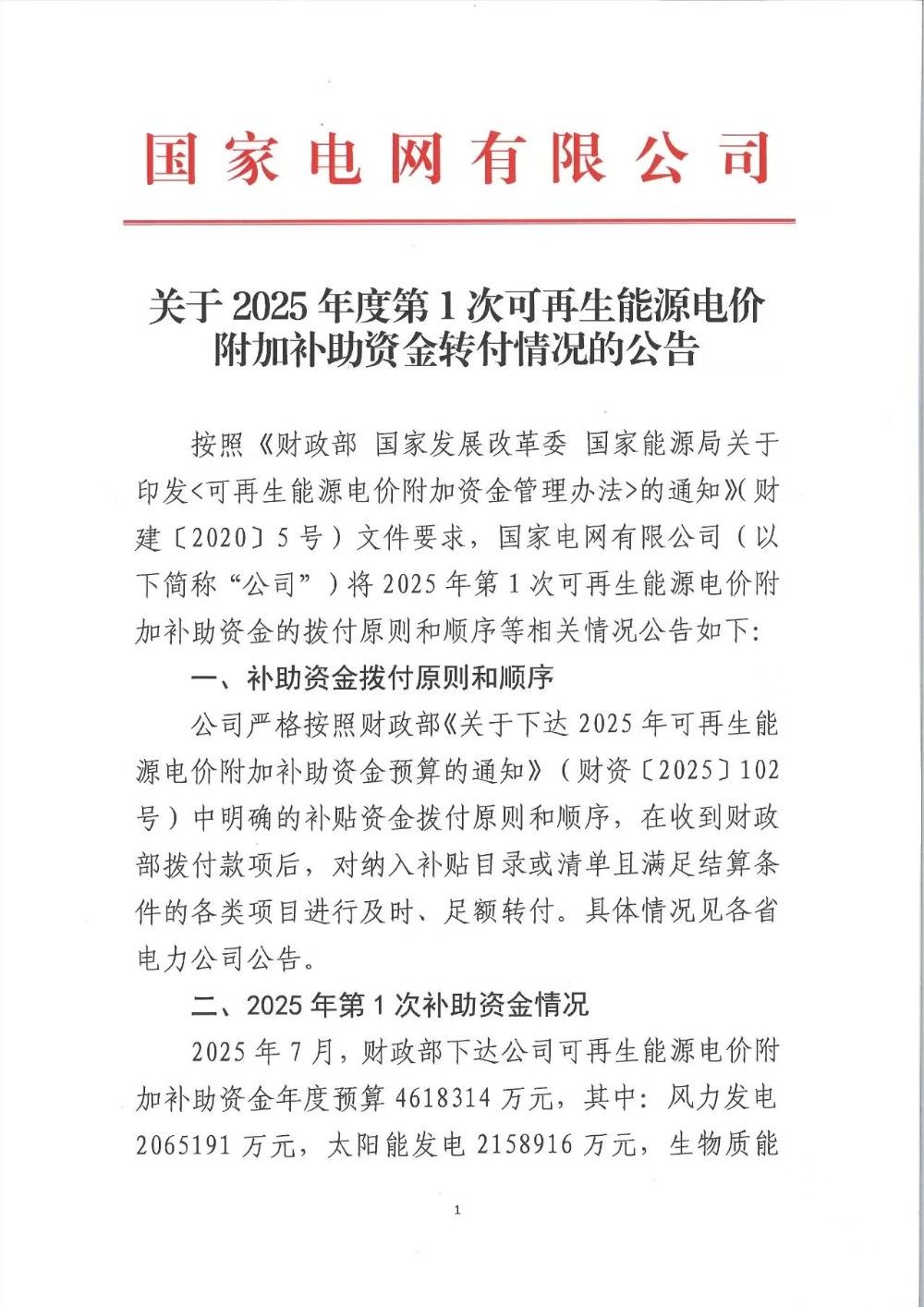 國家電網(wǎng)有限公司關(guān)于2025年度第1次可再生能源電價附加補助資金轉(zhuǎn)付情況的公告
